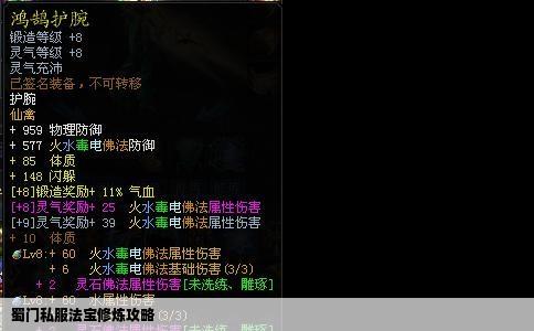 在蜀门私服游戏中,法宝的修炼是提升角色战斗力的重要一环。本文将详细介绍如何有效地修炼法宝,帮助玩家在游戏中取得更好的成绩。法宝修炼基础1. 法宝选择:玩家需要根据自己的职业和游戏风格选择合适的法宝。不同的法宝具有不同的属性和技能,合理选择能更好地发挥角色特点。  2. 修炼材料:修炼法宝需要消耗...